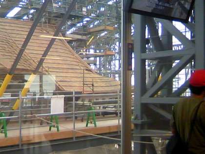 いよいよ最後の見学になりました。雨もあがりお天気の中,姫路城改修工事見学をしました。修理の様子を見学できるのは今だけ。しゃちほこの高さまで上がって屋根の修理を間近で見たり,景色を眺めることもできました。