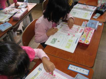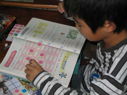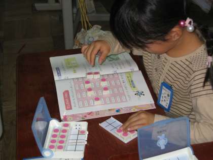 算数ではくり上がりのあるたしざんを学習しています。はじめは,計算のしかたを理解するのに,時間がかかりましたが,少しづつ速くできるようになってきました。この写真は,答えが11になる式をさがして,その上に数図ブロックをおいているところです。