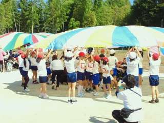 支部10校の子どもたち約100名が,学校ごとに紅白に分かれ,玉入れ,綱引き,折り返しリレー,かけっこなどの競技に汗を流しました。
