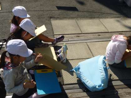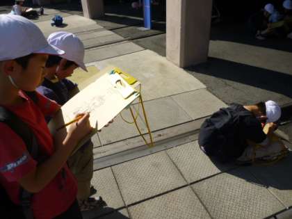 機関車館の機関車の絵を描きました。機関車の絵をはじめて描くのですが,楽しんで描けました。大きさなど工夫してかける子どももいました。車輪の大きさや全体の大きさに驚いたようです。