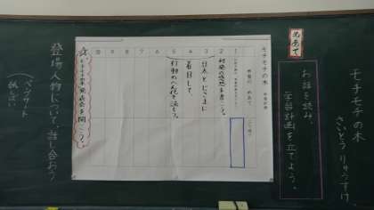 「モチモチの木」では,どんな学習のすすめ方をしていきたいか,考えを出し合いました。登場人物に着目して読みを深めることをねらいとして,計画を立てたのですが,音読げきや,ペープサートなど,読み取ったことをなにかの形で表げんしたいと思っている人が多かったです。