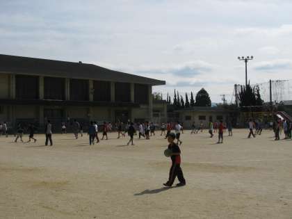 運動場中におはじきを広げたように,子どもたちが遊んでいます。