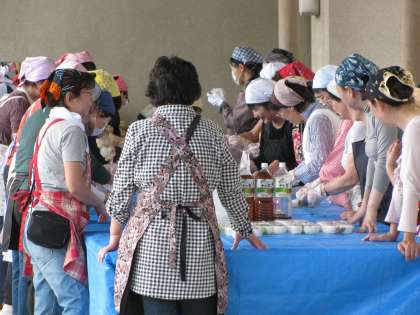 写真は,地域防災部単位でお集まり頂いた様子,給食班による給食給水訓練の様子と,消防署員救助隊による救助訓練の様子です。