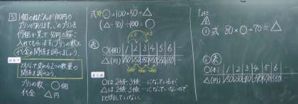 算数では,伴って変わる2つの数量の変わり方の違いについて式と表を使って考えています。