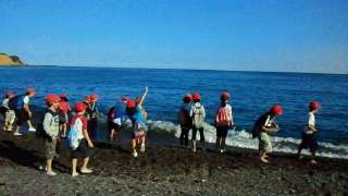 昼食を食べた後は,大野浜での活動です。地球の丸さを実感できる水平線やきれいな海を見て,子どもたちは大喜びでした。青い空,青い海で素敵な浜での活動ができました。