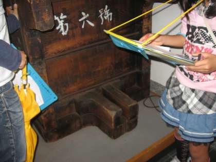 お酒は絞って作られるというのをはじめて知った子どもたちは、この酒槽を見て「ここからお酒が出てくるんだ。」「大きいな。」と言いながら触っていました。