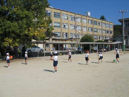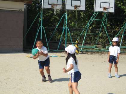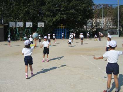 11月からしばらく運動場での体育は,パスゲームをします。今日は,第1時なので,グループに分かれてパスの練習をしました。味方に上手にパスをしたり受け取ったりしなければなりません。日ごろボールで遊んでいない人が多く,ボールをこわがっている人もいます。これから,練習を重ねて,パスが上手になってほしいです。