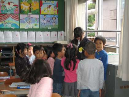 今日から1週間,桃山中学校の2年生4人がチャレンジ体験(職場体験)にきています。1年2組にも,一人入っています。あっと言う間に子ども達の人気者になりました。いつも周りには,子ども達がいっぱいです。担任と一緒に学習のお手伝いをしてくれています。早くみんなの名前を覚えてもらいましょうね。