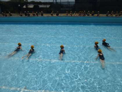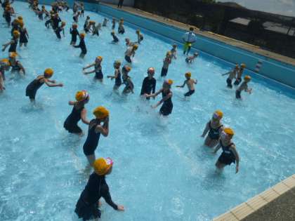9日(木)はお天気に恵まれ,水は少し冷たかったですが,プールでみずあそびを楽しむことができました。安全に水泳学習を行うための約束を確かめて,プールに入ると,子ども達の喜びの声が聞かれました。「水かけあそび」や「わにさんあるき」などをしました。お天気は心配ですが,来週からの学習が楽しみです。