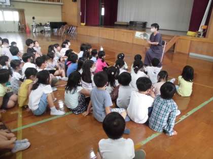 10日(金)の中間休みに,体育館で「お話玉手箱」が開催されました。お話玉手箱の方が,子ども達にいろいろな絵本の読み聞かせをしてくださいます。参加は自由ですが,ほとんどの1年生が喜んで体育館に集まり,お話を聞いていました。今回は,最後に巨大な扇風機がみんなを吹き飛ばしてしまうお話で,想像した子どもたちは「わあ〜!」と声をあげていました。