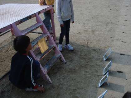 グループに分かれてまとに太陽の光を当て、温度計を使って温度の変化を確認したり、さわってみたりしました。