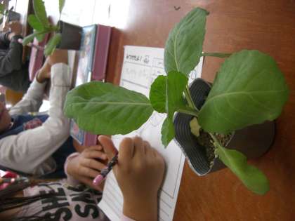 春から夏にかけて育てた経験を生かして,キャベツを育てます。苗から育てるので,今日は苗をくわしく観察しました。