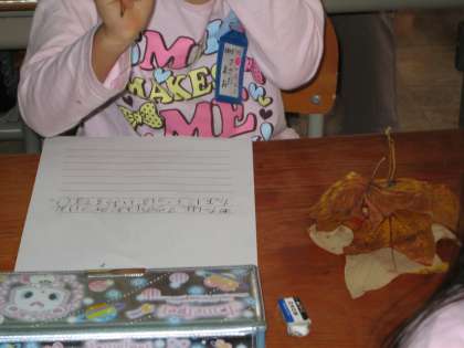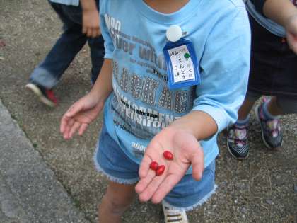 冷え込みがきつくなり,学校の木々も美しく紅葉してきました。そこで,生活科では,学校の中をを歩き,秋を見つけました。「知恵のいずみ」のところにあるみかんの木にみかんがなっているのを見て驚いていた子ども達。赤く色づいている木や黄色く色づいた木を探して大喜びの子ども達。たくさん秋を見つけることができました。