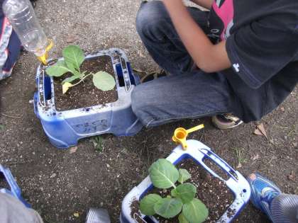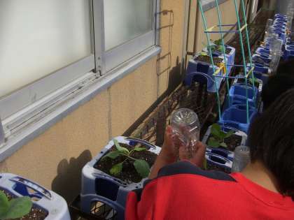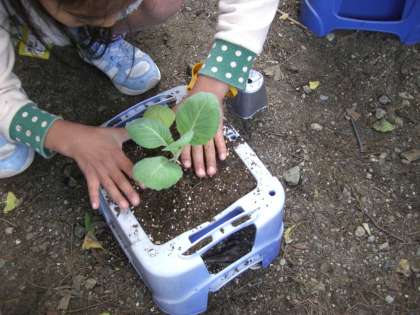 ミニトマトを育てたあとの土と肥料の混ざった野菜の土をよく混ぜて自分の植木鉢に土を作りました。そしてフラワーポットから苗を土ごとそーっと出して植えます。さすが,なすやオクラの経験もあるので手際がよいです。