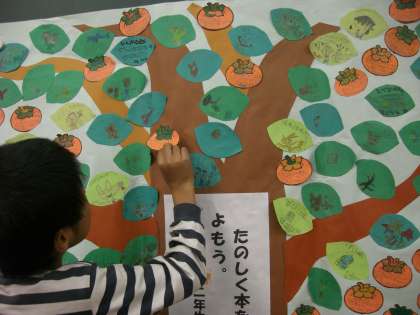 読書週間の取組みのひとつに,心に残った一冊を短文で紹介する活動を行いました。春にも同じように一冊を選び,題名と絵で葉っぱに書きました。そこに,今回は心にのこった一冊の題名と一言感想を書いた柿の実を貼っていきます。