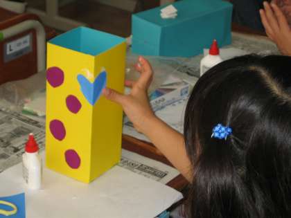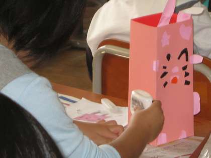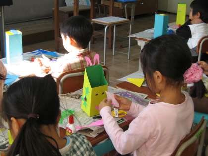 図工では,「プレゼントをどうぞ」に取り組んでいます。はこを作って,飾りつけをしています。飾りつけが終わったら,はこの中に入れるプレゼントを作ります。プレゼントをあげる人を思い浮かべながら,がんばって作っているところです。どんなものができるか楽しみです。