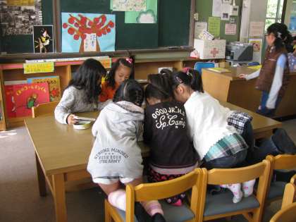 その隣のテーブルでは,2年生の子どもたちが,身を乗り出し,頭を寄せてこれまた一心に同じページを見つめています。
