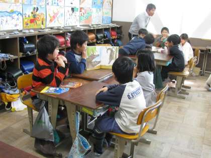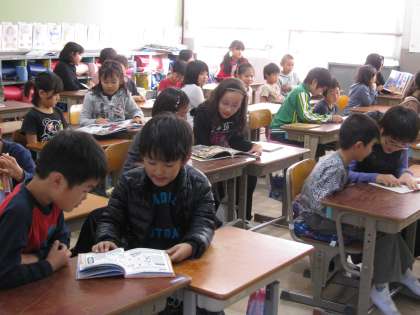 聴いている下の学年の子どもたちも,熱心にページを覗きこんでいます。