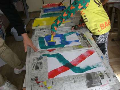 今日は,版画和紙にローラーで色をつけました。
