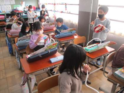 鍵盤ハーモニカの演奏に合わせて、カスタネットとタンバリンをたたきました。
