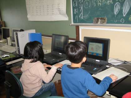 1年生は初めてコンピューター室に入って学習をしました。まずは,コンピューター室の約束を聞きました。つぎに,マウスの持ち方・ノートパソコンのふたの開け方から立ち上げ方を教えてもらって操作しました。それから,ゲーム仕様になっているマウスの使い方をしました。遊び感覚で楽しんでいた子ども達です。