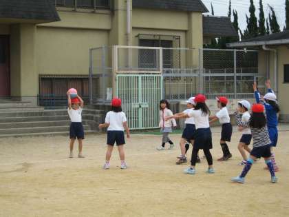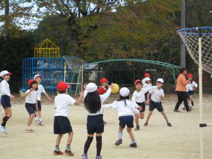 パスゲームを始めて数回になります。1年生はゲームの面白さがわかり,とても楽しみにしています。今日も寒さに負けず,ボールを追って走り回っている子ども達です。