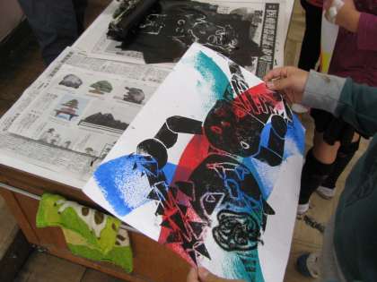 そして,今日は,出来上がった版にインクをたっぷり刷り込んで,あらかじめローラーを転がしてカラフルに創っておいた和紙に載せて,うつしとっていました。