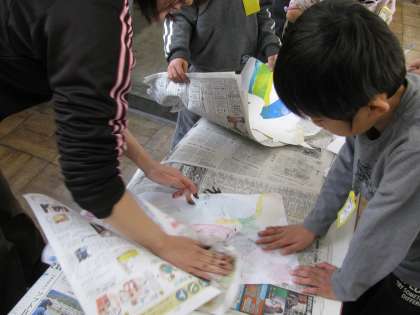 2年生の教室では,紙版画の最終段階の「刷り」をしていました。