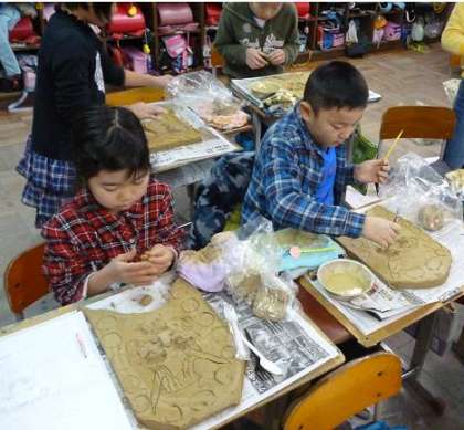 下絵を鉛筆でかいて,粘土を付け加えたり,ほったりしながら自分の考えた顔を作っていきました。途中,思ったようにいかなくなった子もいて,目をこうしたいんですが…。」「つのはどうやってつけたらいいですか?」といいながら,たくさんのアドバイスをしてもらっていました。