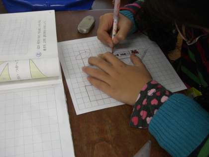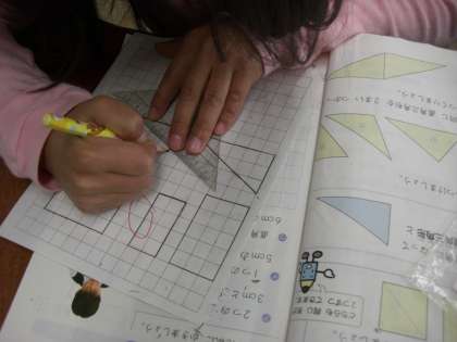 今日は方眼紙を使って,長方形や正方形,直角三角形を描いてみました。ものさしを方眼に合わせて,辺と辺がきちんと合わさるように気をつけます。直角になっているかを三角定規で確認していた人もいました。はみ出さないように,隙間ができないように図形を描くのは難しそうでしたが,集中して描いていました。