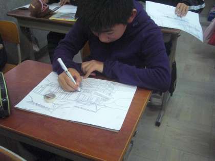 歴史めぐりで自分たちで撮ってきた写真を見ながら,細かいところまでしっかり見て,下絵を描きました。次は,板にうつしていきます。