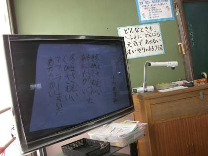 なかなか思い浮かばず,真っ白の紙を眺めてうーーーーん・・・・と考えている人もたくさんいました。上手に書いている人の作品を紹介すると少しずつ書き始めることでき,だんだん自分の作品が出来てきて楽しくなってきたようです。明日も続きをします。