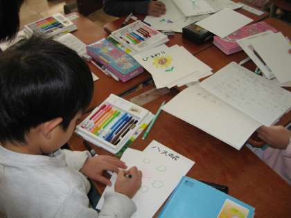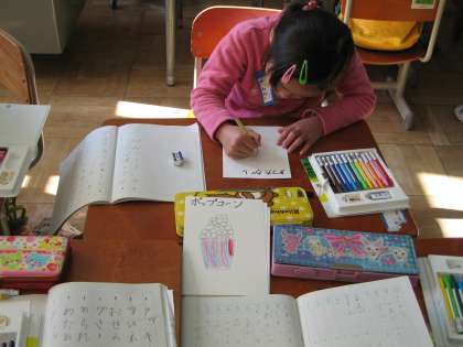 国語の授業は今「ものの名まえ」と「おみせやさんごっこをしよう」をしています。「ものの名まえ」で学習したことをもとにして,おみせやさんごっこをします。一つのグループに一つのお店をします。例えばさかなやさんになれば,売り物を考えます。あじやさば・たい・さんま・ひらめなどを考えます。次にそれをカードにかきます。子ども達は早くおみせやさんごっこをしたくてワクワクしています。ごっこ遊びを通して,一つ一つの名まえやまとめてつけた名まえを自然に身につけていきます。さあ,どんなお店ができるかしら?
