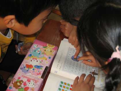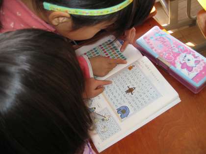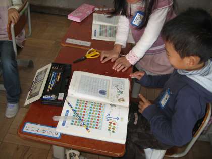 算数では,100までのかずの表を使ってゲームをしました。動物の形を表の上に置いて隠れている数を当てます。隣の人と当てあいっこをしながら,数の順列や順序を覚えていきます。