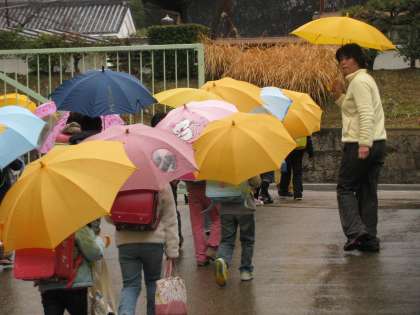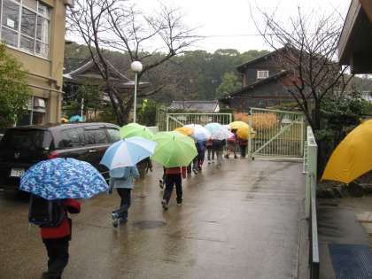 傘をさして,子どもたちが帰っていきます。