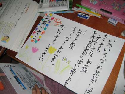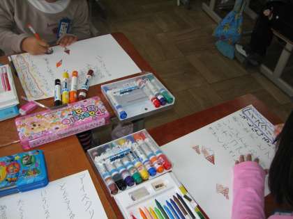 国語の授業では,お店屋さんごっこをするために色々準備をしています。今日はちらしを作りました。ちらしを書く上で大事なことを話し合いました。お店の名まえを大きく書くこと・おすすめの物を書いたり絵を描いたりしてお客さんが買いたがるようにすること・誘う言葉を書くといいことなどを確認して書きました。書き終わったら,教室の中に貼りたいと思います。
