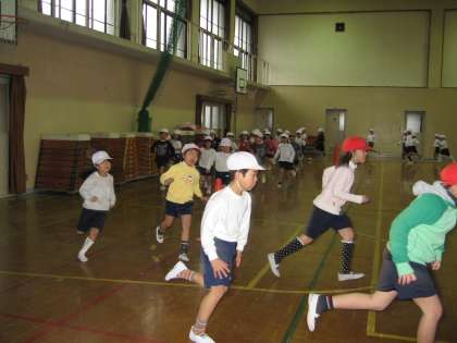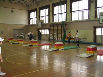 今日は残念ながら雨です。でも体育は1年生全員で跳び箱をしました。1年生全員で集まるのは久しぶりです。まずは身体を温めるために走りました。その後,またぎ越しやまたぎ跳びや開脚前とびなどをしました。がんばって跳んでいた子ども達です。