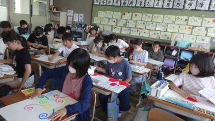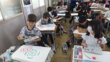 前回学習した「心のもようをイメージしよう」では、色鉛筆やクーピーで美しいデザインを描くことができました。