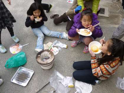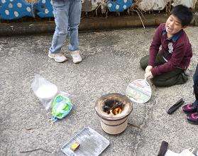 焦げないように割り箸で裏返しましたが,やはりちょっとこげてしまった班もありました。でも,おもちがふくれてきたときには「やった!!」という大歓声。