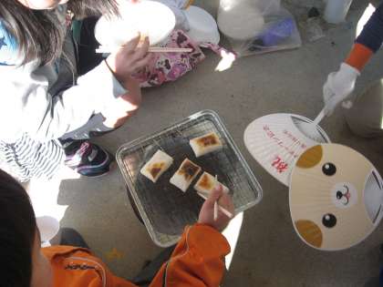 雪が舞う寒い日だったのですが,七輪のおかげであたたかく,おいしいおもちをいただくことができました。