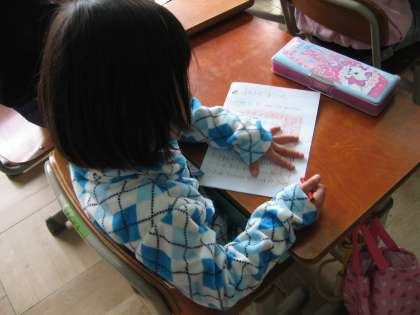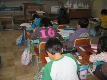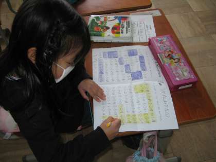 ステップタイムの時間には,おもに計算練習をしています。この日は,計算をした後,指定された答えの所を色塗りしました。すると形が出てきます。速さを競い合ったりゲーム感覚で計算したりしながら力をつけています。