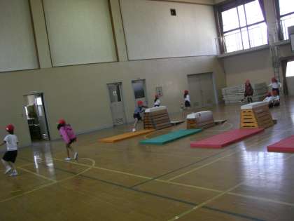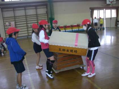 今年は重たい方の跳び箱も使うので,グループでしっかり分担して跳び箱を慎重に運びます。マット,踏み切り板も用意しなければいけませんので,準備をスムーズにできるように練習します。