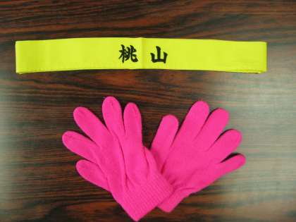 体操服上下,黄色のはちまき,ピンクの手袋です。