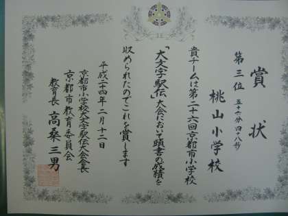 12日に開催されました第26回京都市小学生「大文字駅伝」大会で,桃山小学校は第3位に入賞しました。