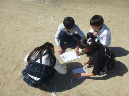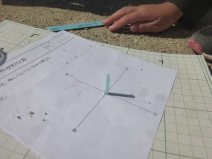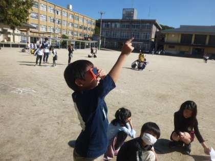 理科では、かげの動きを観察することで、太陽がどのように動くのかを調べています。今日は、1時間ごとにかげがどちらの方角にできるか調べたり、遮光版で太陽の位置を確認したりしました。「かげは時計まわりに動いている!」「かげの長さも変わっているよ!」と気が付く子ども達がたくさんいました。
