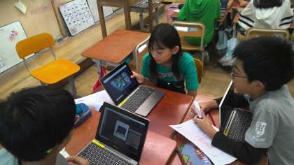 10月18日(水)の1組の図画工作科『まどをのぞいて』は、昨日までに作った作品を自分で写真に撮り、それを見せながら友達に紹介しました。