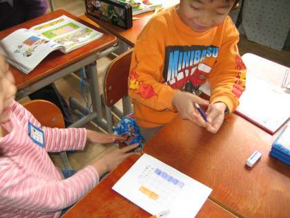 算数の授業で,場所取りゲームをしました。じゃんけんで勝ったら,1マス塗っていきます。全部塗りつぶしたら,自分の色を数えます。勝敗がかかっているので,子ども達は必死でじゃんけんをしています。楽しく広さくらべをしていました。