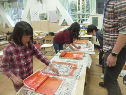 図画工作科「いろいろうつして」では、スチレンボードに彫った背景を刷りました。友達と協力して、版画用のインクをローラーでぬったり、版画用の紙をこすったりしました。紙をめくると現れた絵に、「うわあ!できた!」と感動している様子が見られました。この後、画用紙や段ボール、緩衝材などを使って生き物などを作り、重ねて刷って仕上げていきます。どんな作品に仕上がるかとても楽しみです。
