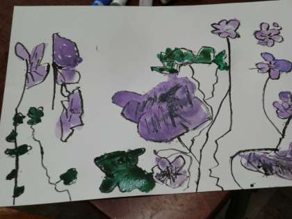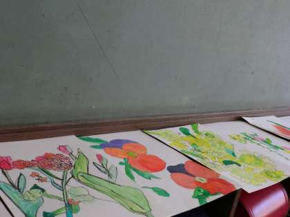 先週から図工では『春を描こう』ということで,花壇の花の中で気に入った花を選んでスケッチしています。割り箸ペンやコンテで細かい所までよく見て描き,今日は絵の具で色をつけました。花をよく見て,そっくりの色を一生懸命作っています。とても春らしい絵に仕上がりそうですね。きれいなお花で教室の後ろが明るくなるのが楽しみです。