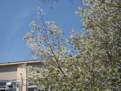 白い花と,若草色の若葉が一緒になって,優しく春の風に揺れています。